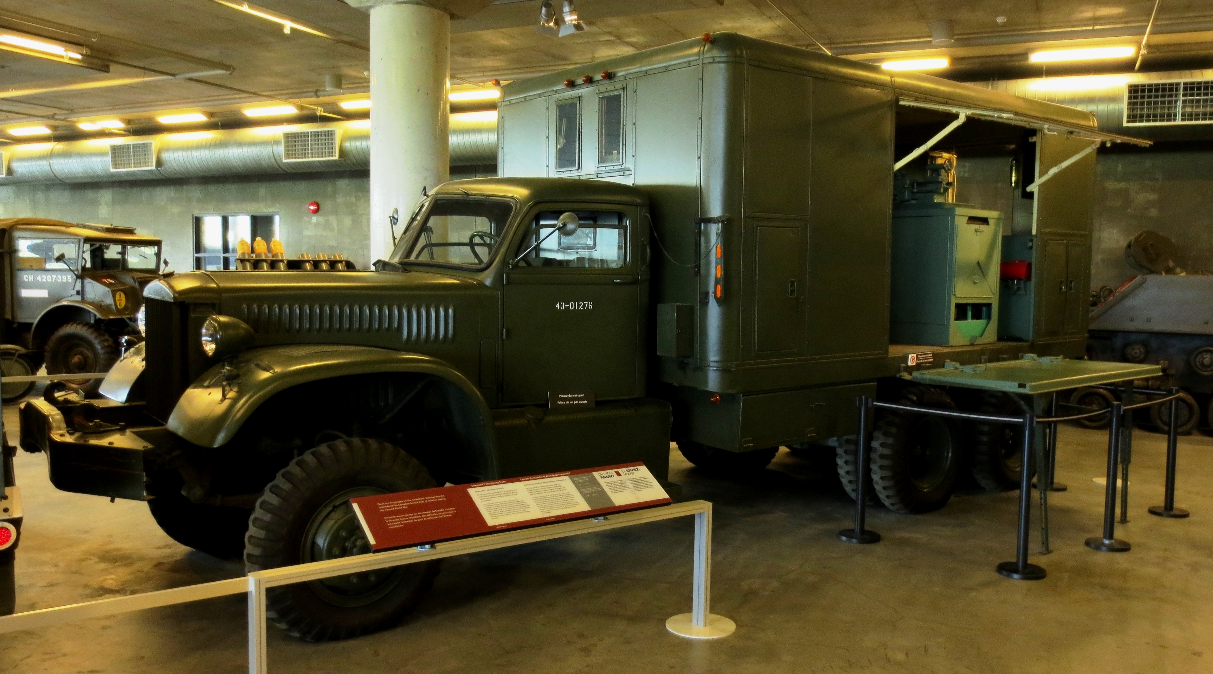 Diamond T Field Shop Truck, 43-01276. The Type “M” Machinery Lorry was a version of the American Diamond T 4-ton 6×6 Model 967 cargo truck. The Royal Canadian Electrical and Mechanical Engineers and the Royal Canadian Army Service Corps workshops used the vehicle to repair automotive components and parts. On-board equipment normally included a bench lathe, paint sprayer, valve grinder and refacer, pinhole grinder, bench grinder, brake re-liner, and battery charger. In 1994, the CWM artefact was restored by 202 Base Workshop in Montreal as an automotive machine shop.