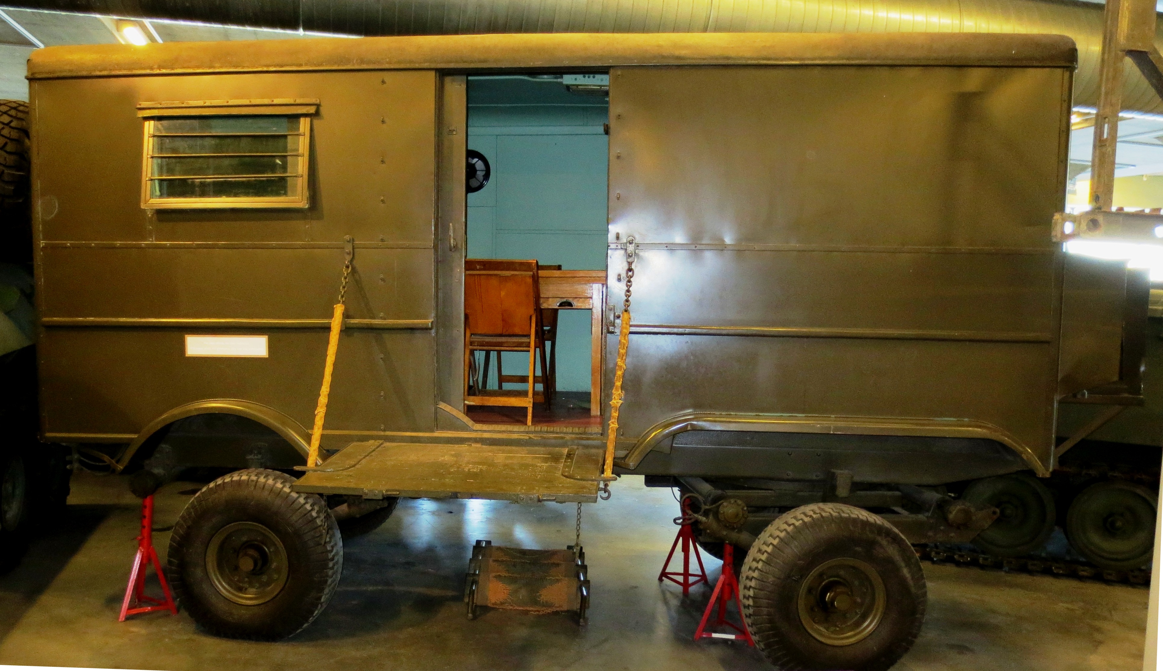 General H.D.G. Crerar’s Command Post caravan. General H.D.G. Crerar was appointed commander of the First Canadian Army in February 1944. He immediately ordered a new caravan mounted on a Diamond T 975 truck chassis and an office trailer. This caravan included his quarters – including a bedroom, wash area and personal office. This could be expanded using a tent on the side of the truck. The truck, caravan and trailer came to Canada after the war, but were disposed of without Crerar’s knowledge. The truck has since disappeared, but William Gregg purchased the caravan body itself and it forms part of the Gregg Collection at the RCA museum in Shilo. The Brockhouse Victoria Works manufactured the office trailer. It was presented to the CWM in1959 and is in excellent condition. General Crerar used it as an office and conference room. It was the site of meetings between Crerar, Field Marshall Montgomery, General Eisenhower, and General Bradley. King George VI and Winston Churchill are also recorded as visitors to thetrailer. (From “Wheels and Tracks” magazine, No 7.) CWM 19590017-001.