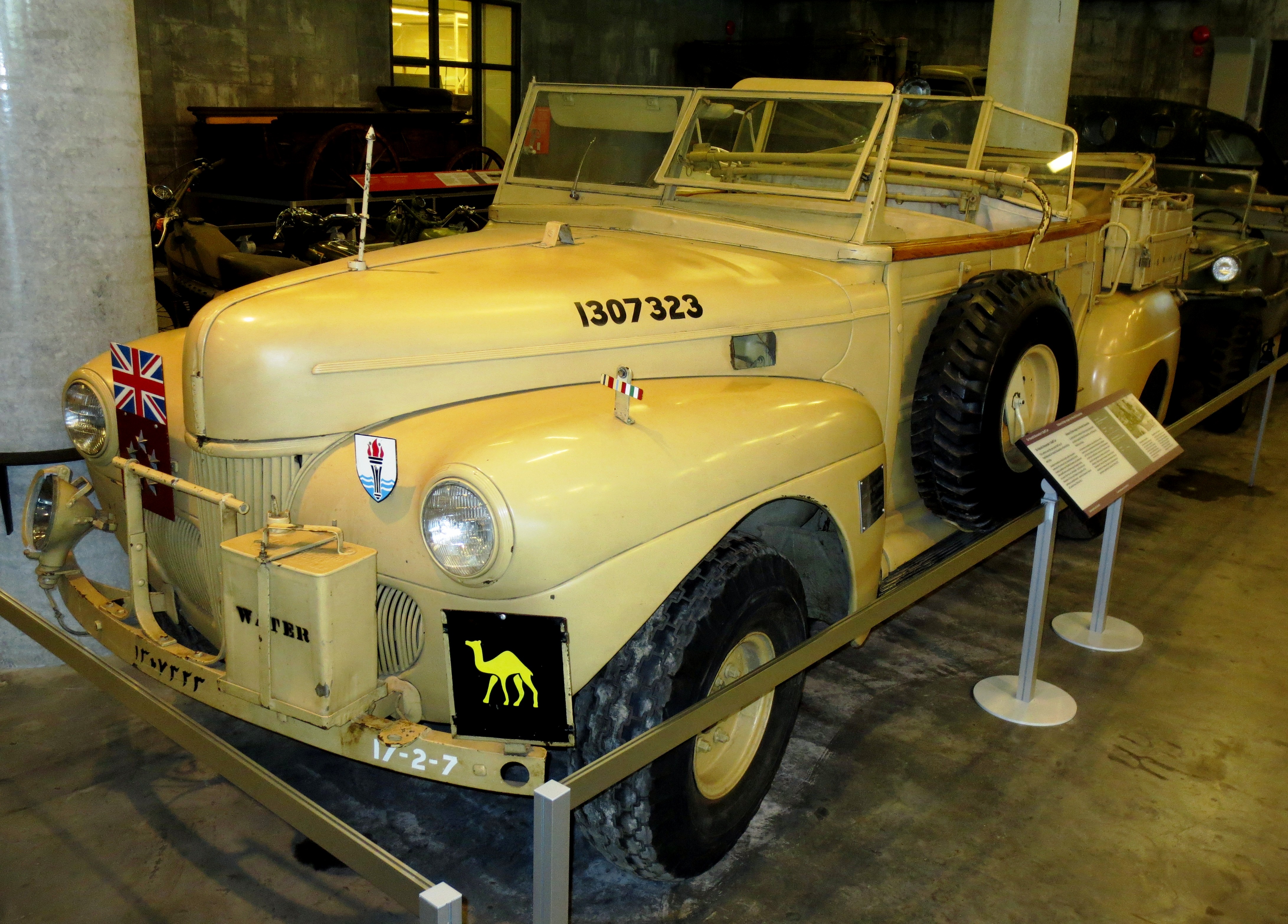 Sir Harold George Alexander, Field Marshal Viscount Alexander of Tunis, used it when he was in North Africa, Sicily, and Italy during the Second World War. When he became Governor-General of Canada in 1946, he brought the car to Canada with him, but found it unsuitable for the climate, and traded it to Ford of Canada for an enclosed car. Ford later donated the car to the CWM. The car reputedly had the same driver while in Alexander’s service, travelled 180,000 miles (288,000 km), had four engine changes, and many overhauls. The vehicle is fitted for operations in the desert, with a radiator condenser, water cans and rear windshield. The doors were welded shut to add strength to the body when the roof was removed. CWM 19490003-001.