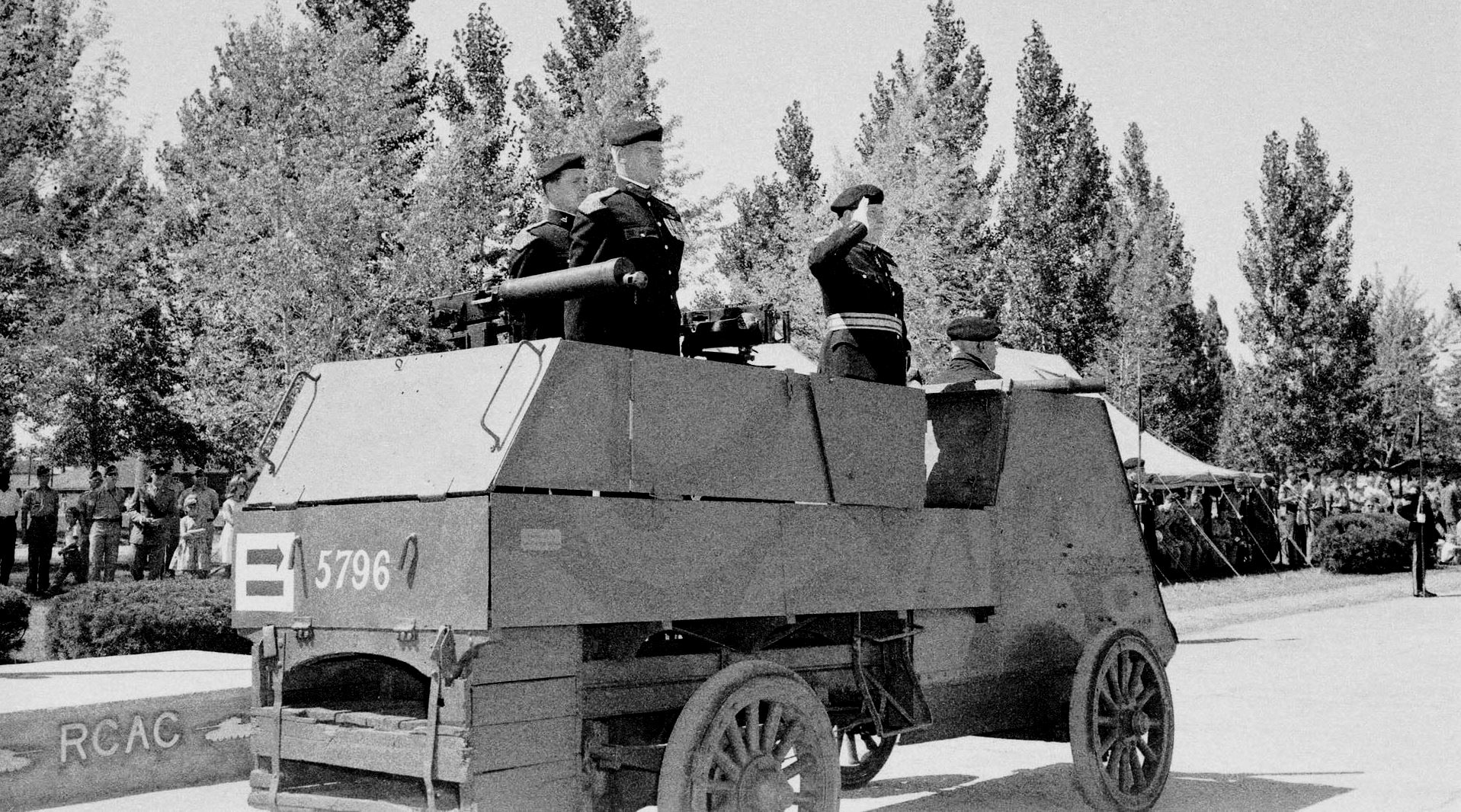 Royal Canadian Armoured Corp Parade at Camp Borden, Ontario, 14 Aug 1966. Major General Frederic Franklin Worthington, MC, MM, CD, Colonel C.A. Greenleaf – Commandant / Director of Armour, Lt. Geddrey – Aide De Camp to the Colonel Commandant, taking the salute from the First World War Autocar Machinegun Carrier. This vehicle is now in the Canadian War Museum.