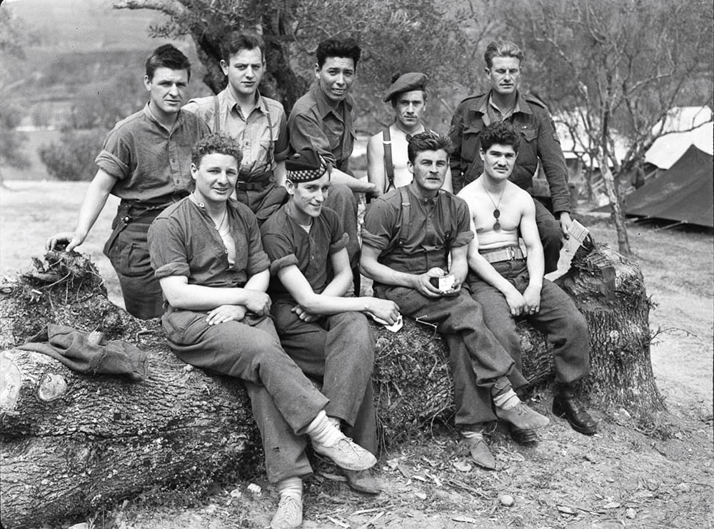 Members of The Cape Breton Highlanders baseball team at the Snow Haven rest camp, Fornelli, Italy, 2 May 1944. Winslow Eagle child noted that his First Nations father top center, Pat Eagle Child, is a Blackfoot from The Blood Tribe, Kainai Nation, Southern Alberta.