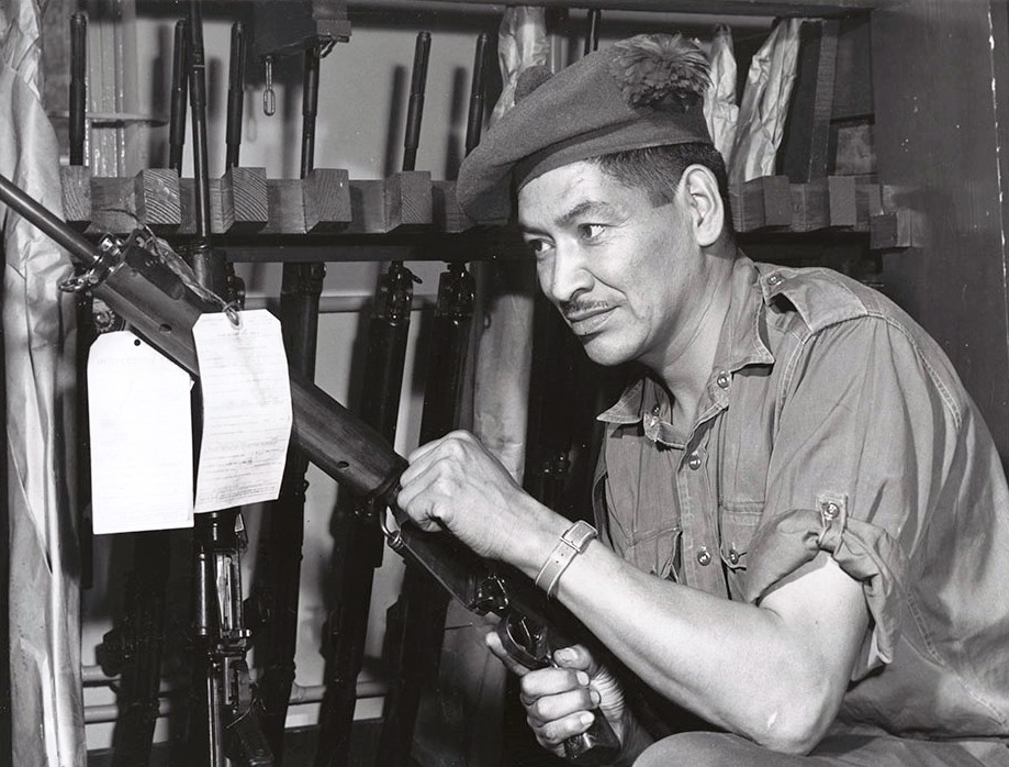 Tommy Prince, an Ojibwa from Manitoba, served with the Princess Patricia’s Canadian Light Infantry in Korea.  He would draw upon his extensive infantry experience in the Second World War with missions like a “snatch patrol” raid. Prince was second-in-command of a rifle platoon and led a group of men into an enemy camp where they captured two machine guns.  He also took part in the bitter Battle of Kapyong in April 1951 which saw his battalion subsequently awarded the United States Presidential Unit Citation for its distinguished service, a rare honour for a non-American force.   His cunning and bravery earned him a dozen medals, including battle honours for service in Korea with the PPCLI.
