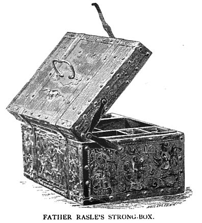 Governor Shute was convinced that the French were behind Wabanaki claims, so he sent a military expedition under the command of Colonel Thomas Westbrook of Thomaston to capture Father Rale in January 1722.  Most of the tribe was away hunting, and Westbrook’s 300 soldiers surrounded Norridgewock to capture Rale, but he was forewarned and escaped into the forest.  They found Rale’s strongbox among his possessions, however, which contained a secret compartment.  Inside that compartment they found letters implicating Rale as an agent of the government of Canada, promising Indians enough ammunition to drive the Colonists from their settlements.