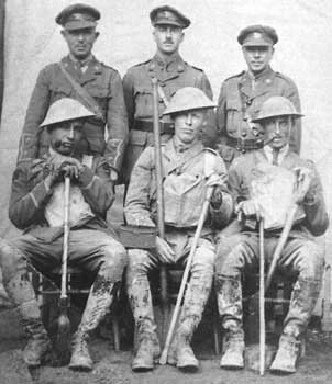 Subalterns of “A” Company, 107th “Timberwolf” Battalion, France, 29 July 1917.  Sitting in the front row, left is Lieutenant Oliver Martin, a Mohawk from the Grand River Reserve; and back row standing at right, Lieutenant James Moses, a Delaware from the same Reserve.  Both were later seconded to the Royal Flying Corp s. Martin survived the war as a pilot, stayed active in the Canadian Militia during the interwar years, and was appointed Brigadier during the Second World War.  Moses was reported missing, later confirmed killed, on 1 April 1918 while serving as an air observer.  A third First Nations junior officer from the 107th, John Randolph Stacey, a Mohawk from Kahnawake, also became a pilot, but was killed in a flying accident in England a week after Moses.