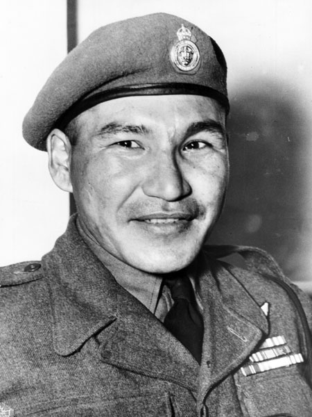 Pte Tommy Prince in the Second World War.  An Ojibwa from Manitoba, he volunteered to be a paratrooper.  He served with the elite Canadian-American commando unit called the First Special Service Force that became known to the Germans as the Devil’s Brigade.  He earned the Military Medal during a battle in Italy, and the Silver Star, an American award for gallantry, for his reconnaissance work in France.  These awards were presented to him by King George VI at Buckingham Palace.