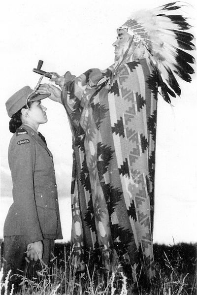 Mary Greyeyes, a member of the Canadian Women’s Army Corps, during the Second World War.   Councillor Harry Bull, of the Piagut Indian community near Regina who lost a leg at Vimy Ridge in the Great War is shown giving his blessing.