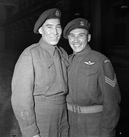 More than 6,000 First Nations, Inuit and Métis served with British forces during the First World War and the Second World War.  A generation of young native men fought on the battlefields of Europe during the Great War and approximately 300 of them died there.  When Canada declared war on Germany on 10 Sep 1939, the native community quickly responded to volunteer.  Four years later, in May 1943, the government declared that, as British subjects, all able Indian men of military age could be called up for training and service in Canada or overseas.