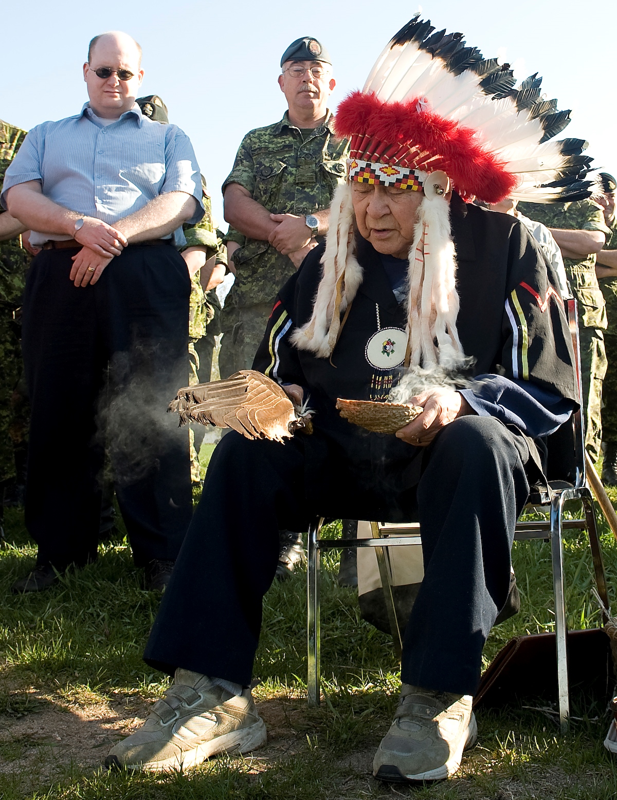 Elder Charles Solomon, New Brunswick First Nations combat veteran of the Second World War, giving a sweet grass blessing at the site of the St. Mary’s Reserve on the Saint John River, 14 May 2009.
