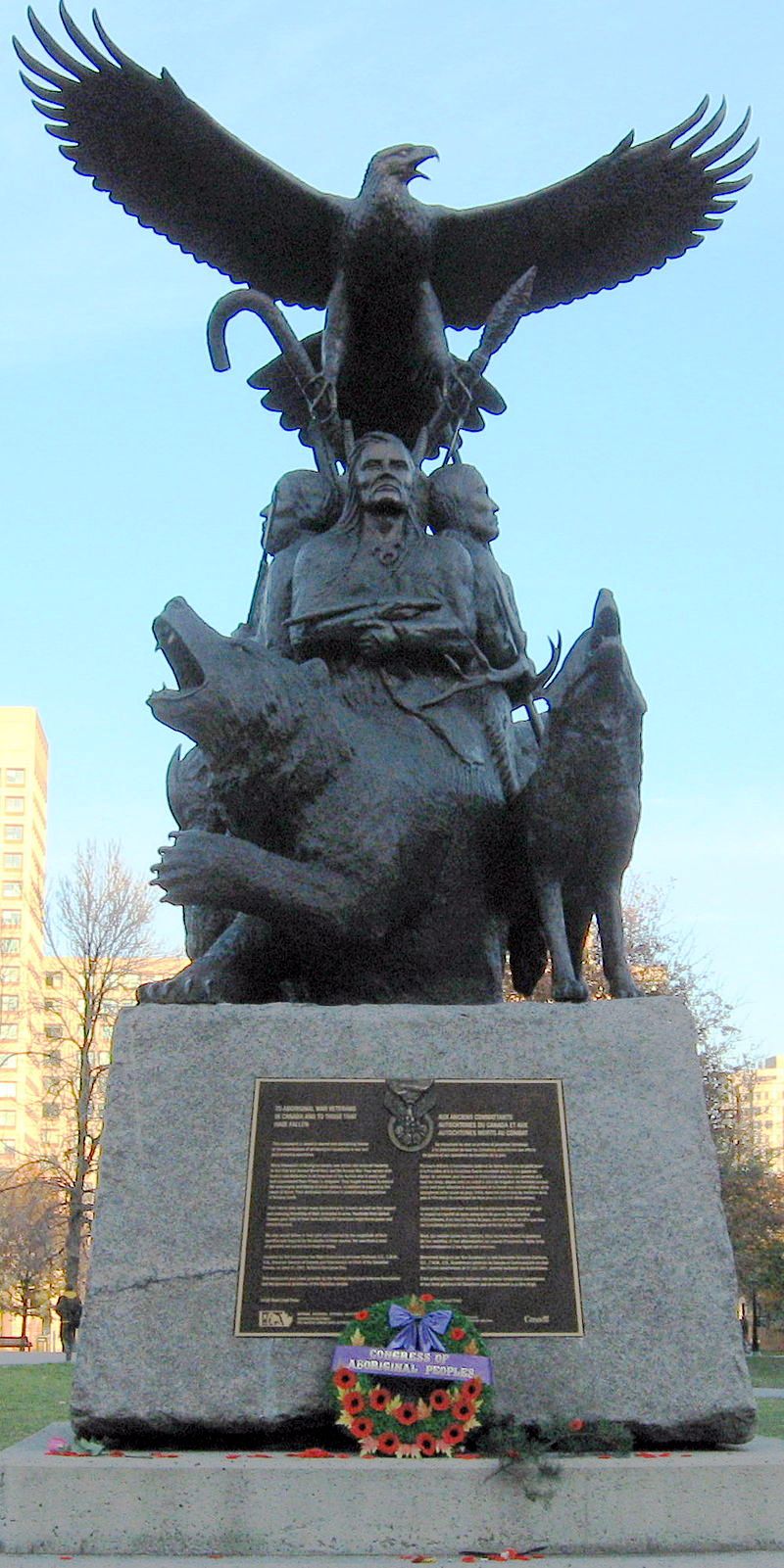 This rich heritage has been recognized in many ways.  The names given to several Royal Canadian Navy warships over the years, like HMCS Iroquois, Cayuga and Huron, are just one indication of our country’s lasting respect for the contributions of Indigenous peoples.  This long tradition of military service is also commemorated with the striking National Aboriginal Veterans Monument in Ottawa.  This deeply symbolic memorial features a large bronze eagle at its top, with four men and women from different Indigenous groups from across Canada immediately below.  A wolf, bear, bison and caribou, powerful animals that represent “spiritual guides” which have long been seen by Indigenous cultures as important to military success, look out from each corner.  Remembrance ceremonies are held at this special monument, including on National Aboriginal Veterans Day which is observed each year on 8 November.