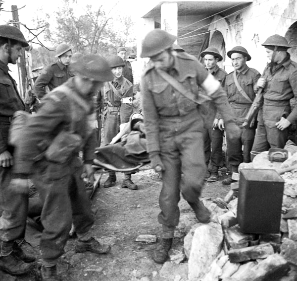 Stretcher bearers evacuating casualties from “A” Company Headquarters, Princess Patricia’s Canadian Light Infantry (P.P.C.L.I.) north of Ortona, Italy, 20 January 1944.