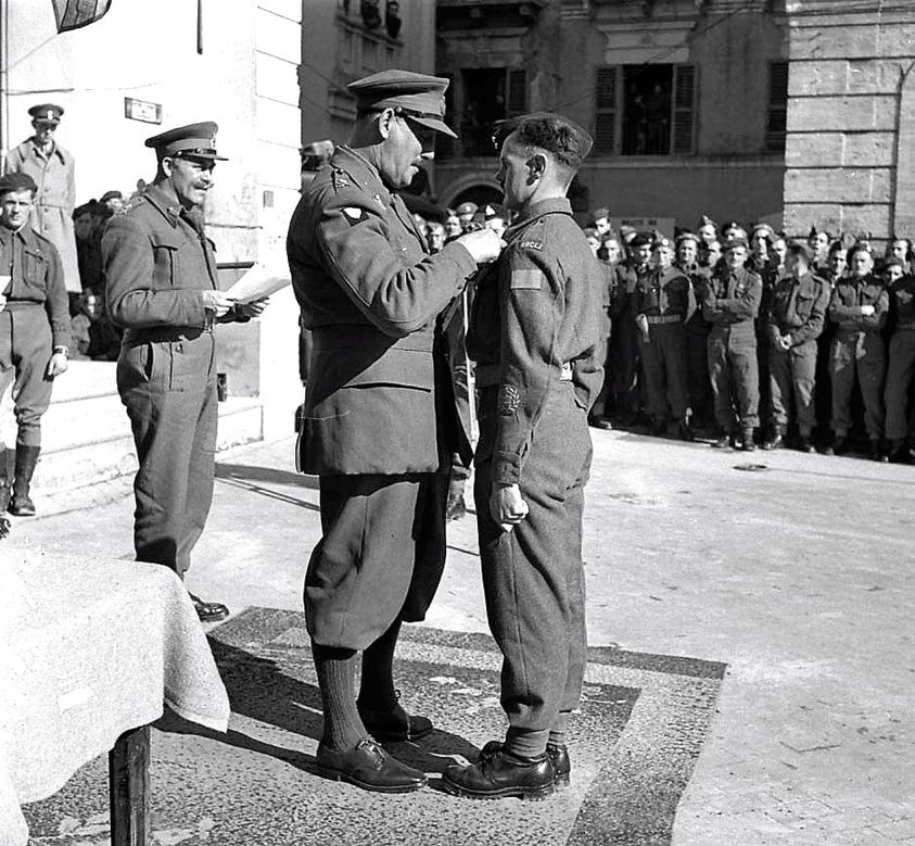 CSM WD Davidson, PPCLI being awarded the Military Medal (MM), by Sir Oliver Leese, Commander of the Eighth Army, 2 March 1944. General Chris Vokes is behind them, holding the award documents, in a ceremony at San Vito Chietino in April 1944.