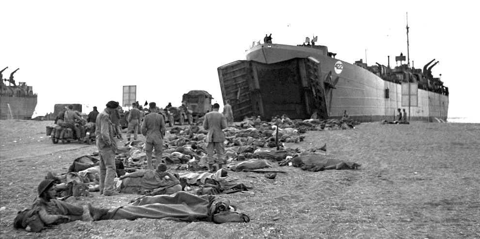 Princess Patricia’s Canadian Light Infantry troops sleeping on beach at dawn with landing ship transport in background awaiting transport to Italy, 4 September 1943, near St. Teresa.