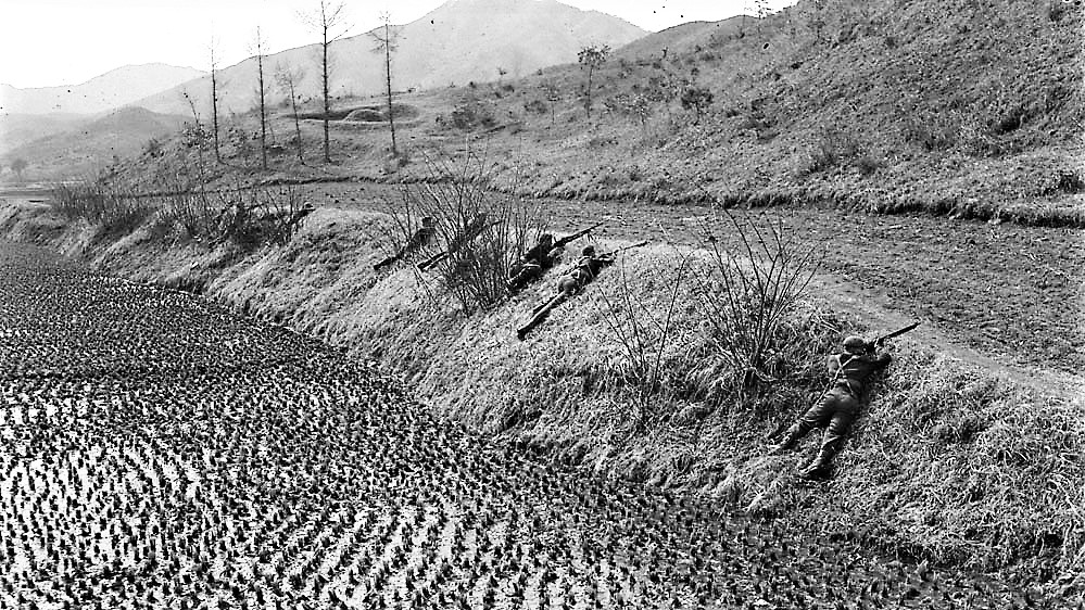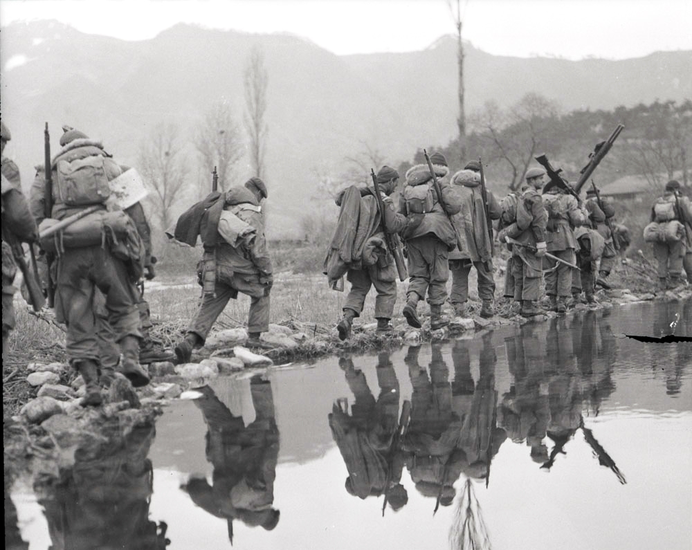 A company of the Princess Patricia’s Canadian Light Infantry moves in single file across rice paddies as it advances on enemy positions across a valley in Korea, March 1951.