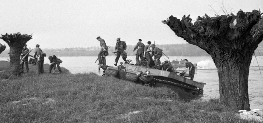 Personnel of Princess Patricia’s Canadian Light Infantry boarding ‘Buffalo’ amphibious vehicles to cross the Ijssel River, 11 April 1945.