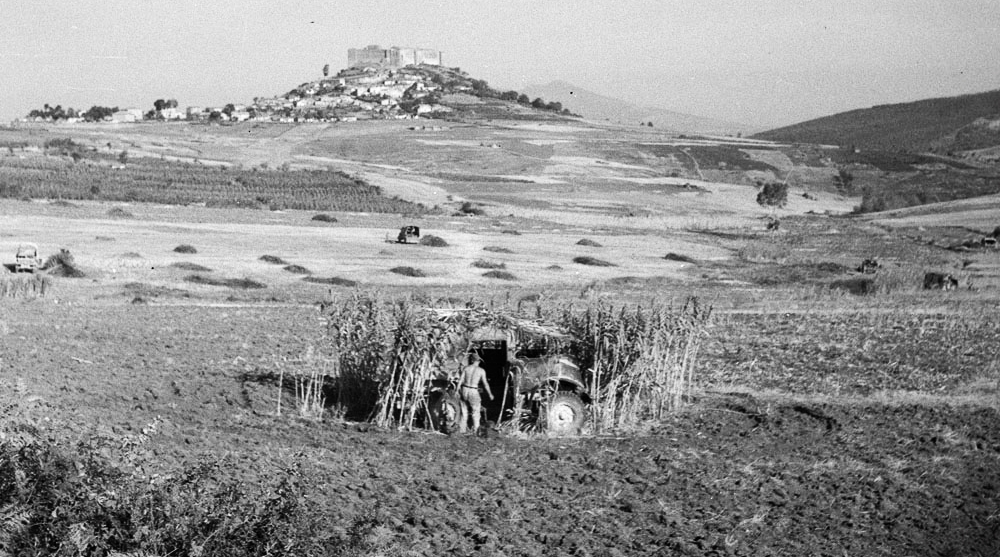 Town of Castel Lagopesole with PPCLI camouflaged trucks. guns, in foreground and hill-top PPCLI occupied castle in background, 1943.