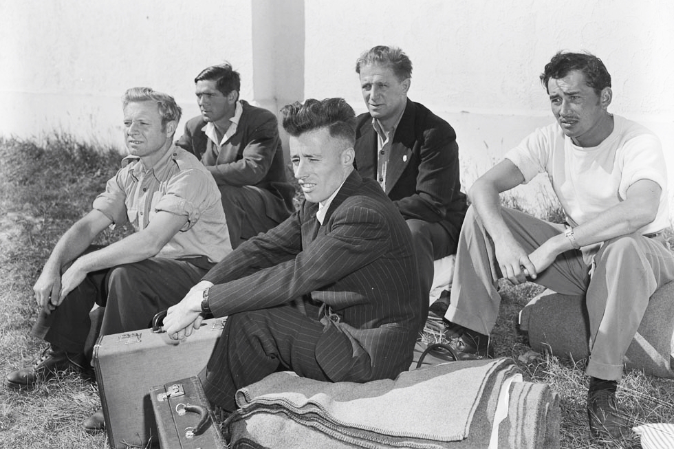 Special Force Recruits: 2nd Bn. PPCLI. Four veterans of the Italian Campaign and a veteran of service in Burma and the Northwest Frontier await transport which will carry them to Sarcee Camp for refresher and advanced training. Front row: Albert Rail and John Gudmundson. Back row: J.F.A. Braham, John Nichol and Leo Ferguson, 1 September 1950. Albert Rail, John Gudmundson, John Nichol and Leo Ferguson were all present at the Battle of Kapyong. (James Morgan)