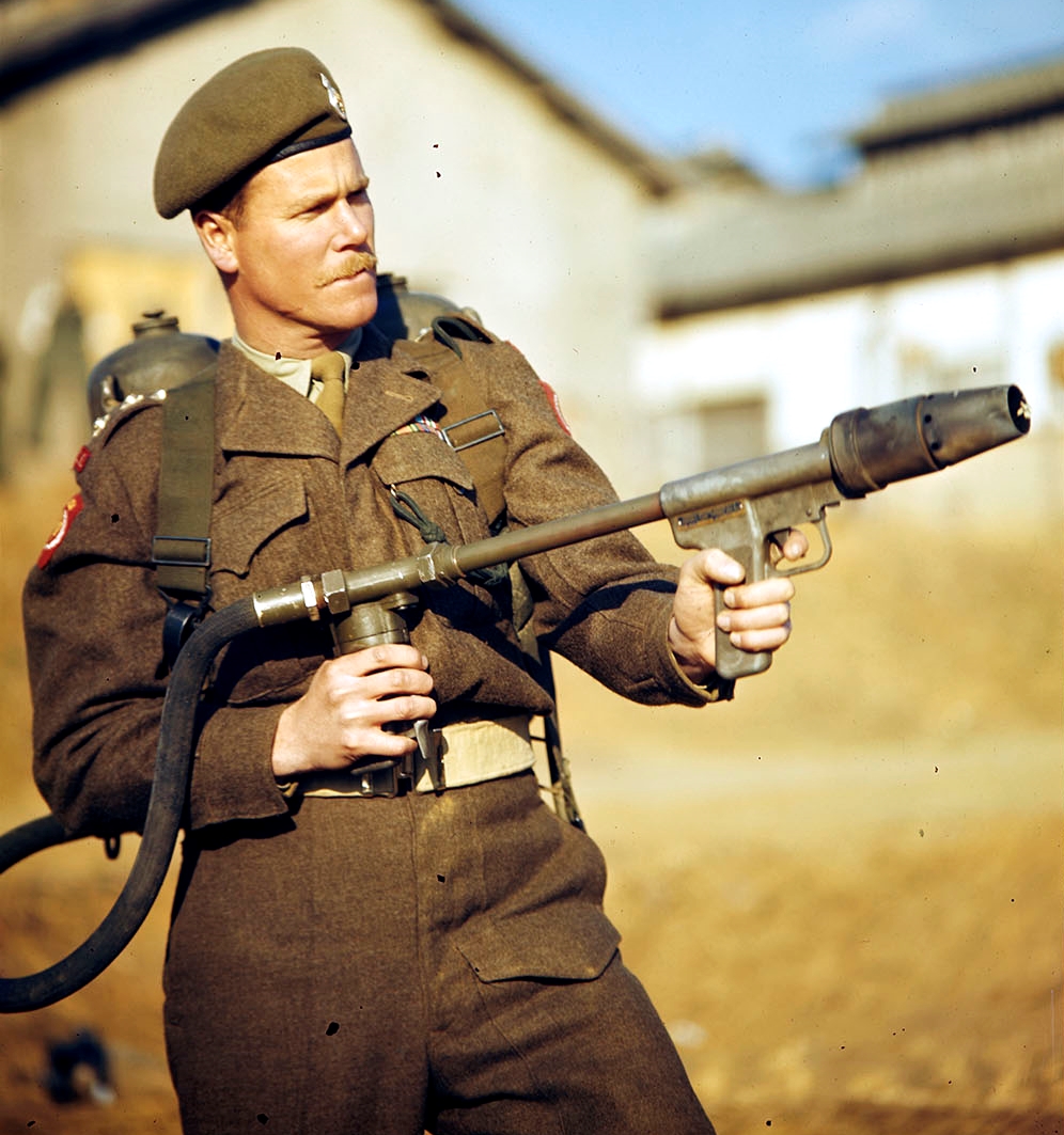 Captain Andy Foulds, 2nd Battalion Princess Patricia’s Canadian Light Infantry in Korea, demonstrating a flamethrower, c1953. He was the OC of the MMG Pl at Kapyong. This is when the Canadians were introduced to the flamethrower by the US troops. There is another shot of an EM playing with it too. He did not have to hump this piece of equipment, but he did need to know how to use it and how to deploy it.