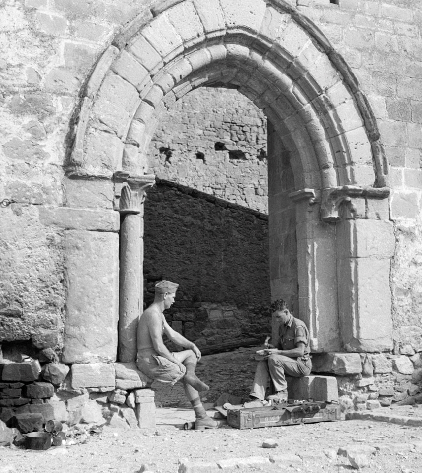 Pte. J. Hubic gives a shoe to Pte. R.J. Edwards to repair in archway of 13th Century Castle which is Coy HQ for the PPCLI at Castel Lagopesole, Italy, 1943.