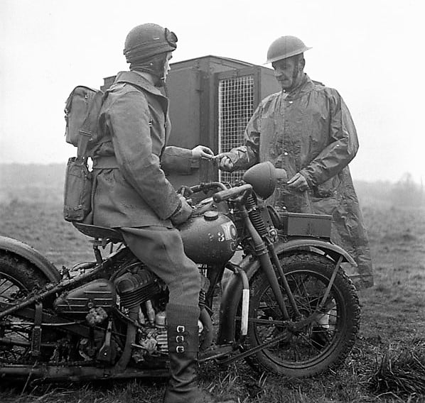 Dispatch rider Private J.W. King (left), who is riding a Harley-Davidson motorcycle, accepts a pigeon message from Corporal J. Hanley, Royal Canadian Corps of Signals (R.C.C.S.), England, 10 February 1943.