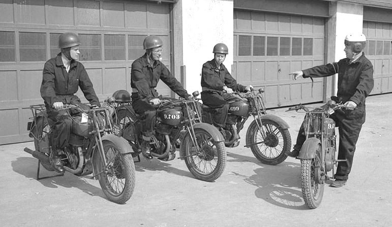 Canadian Officers Training Corps at Royal Canadian School of Signals. Officer Cadet G.W. Procter and some of his comrades take motorcycle instruction.  23 June 1950.