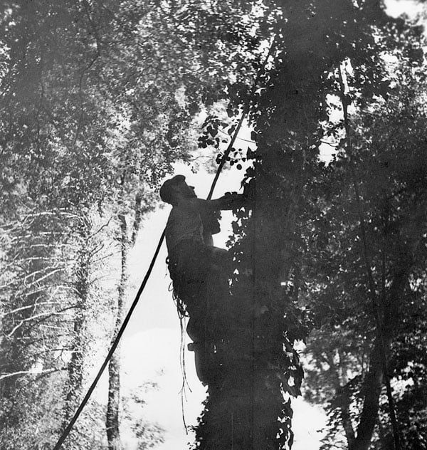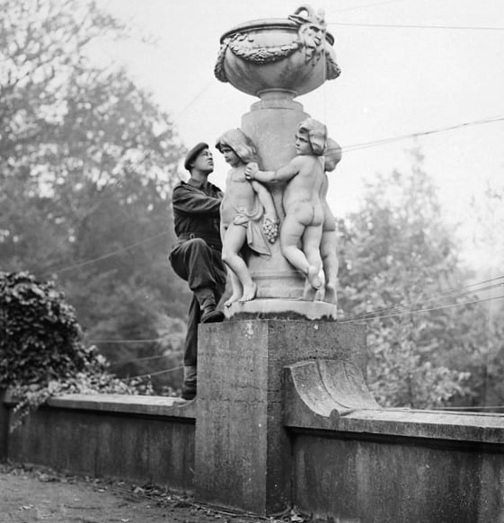 Signalman J.A. Knirchk, Royal Canadian Corps of Signals (RCCS), 4th Canadian Armoured Division, stringing a line on a statue, Eikelenberg, Belgium, 23 October 1944.