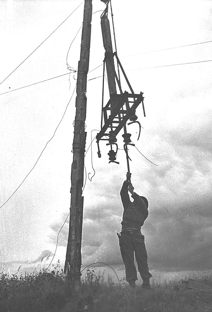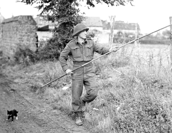 Royal Canadian Corps of Signals soldiers installing communication lines near the French city of  Caen, Normandy, 9 July 1944.