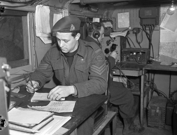 Signalman J.T. Prime of 1st Canadian Army Signals, Royal Canadian Corps of Signals (RCCS), operating a local radio receiver and remote unit, Zeddam, Netherlands, 4 April 1945.