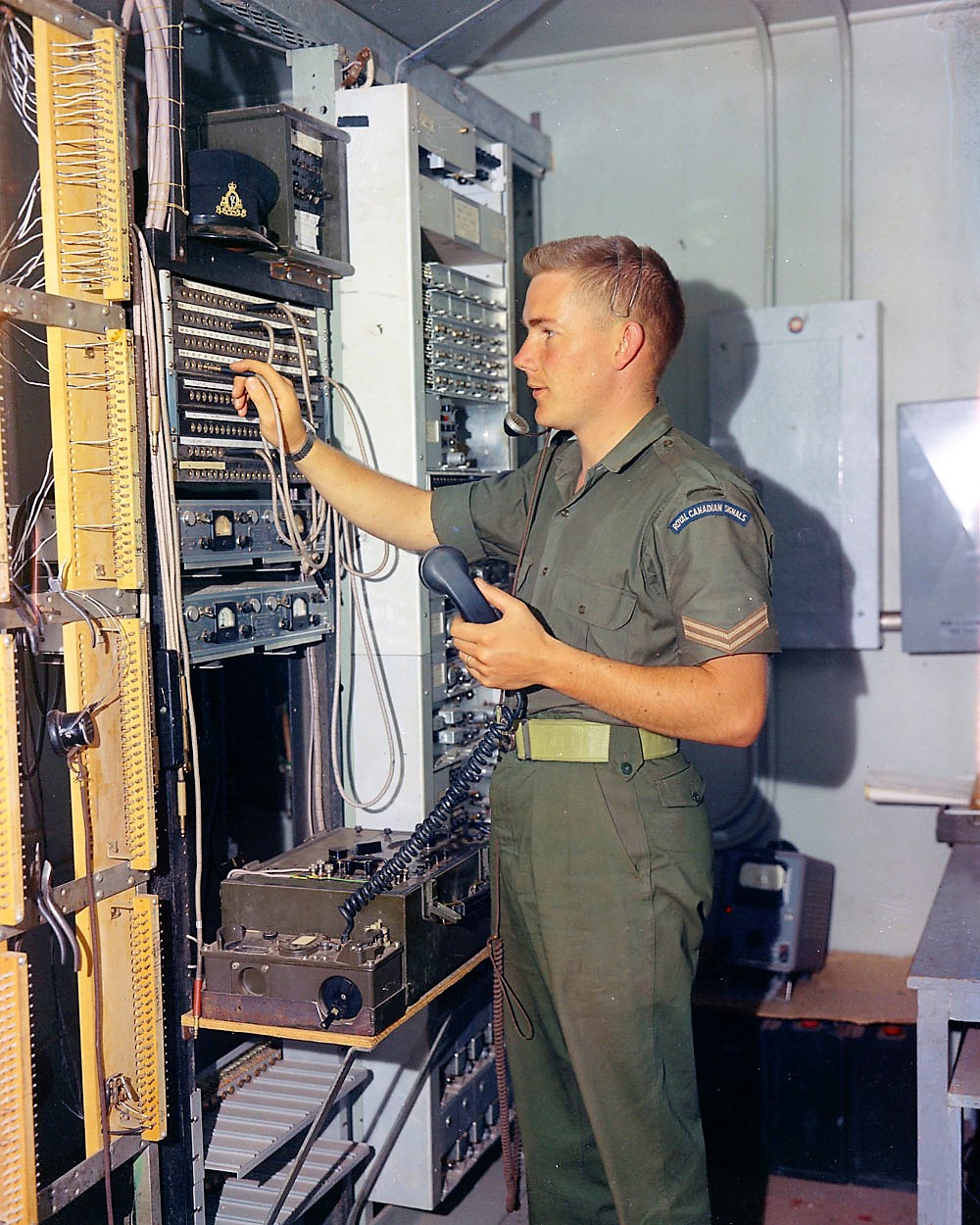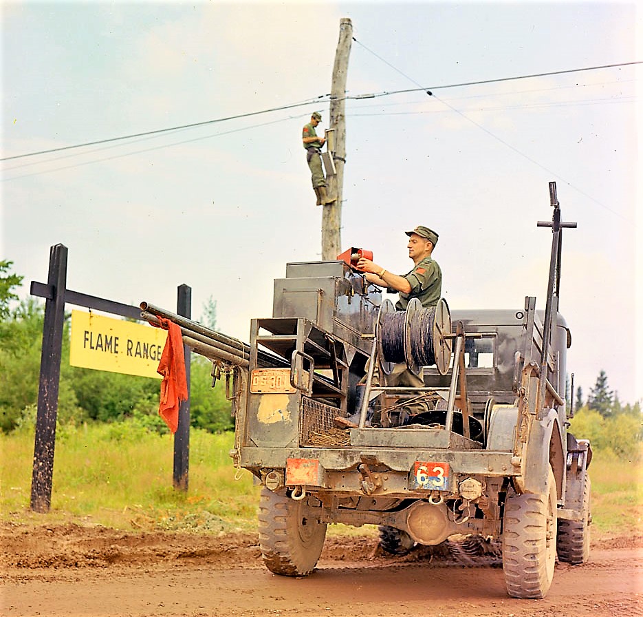 RCCS, 1961 Summer Concentration, Cpl James W. Carter testing the telephone and carrier lines in preparation for the summer concentration exercises, Camp Gagetown, New Brunswick.