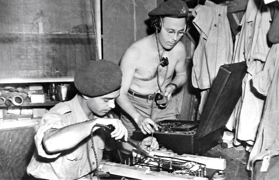 Members of a Canadian special wireless group, training in Brisbane, Australia, for action in the Pacific, are cheerful despite the hottest March in 42 yrs. Shown here testing Canadian radio equipment in Australia are: Signalman J.P. Trottier, and Signalman Maywood, 1944-1945.