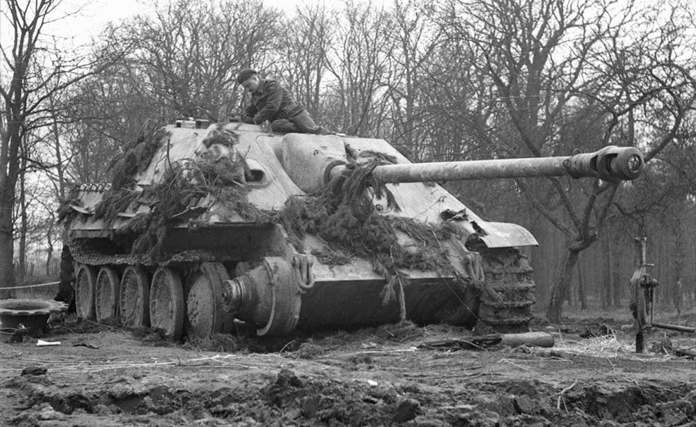Member of the Royal Canadian Corps of Signals looking over destroyed German Jagdpanther self-propelled gun, Northwest Europe, 15 Mar 1945.