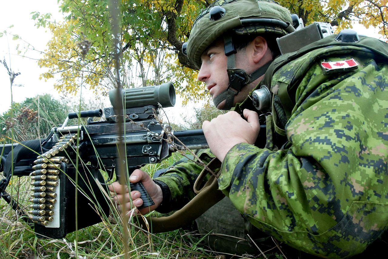 A Canadian soldier with 4th platoon, Hotel Company, 2nd Battalion, Royal Canadian Regiment, provides security with a C9 weapon during training at the Joint Multi-National Readiness Center, near Hohenfels, Germany, 30 Sep 2008. The soldiers were taking part in Cooperative Spirit 2008, as part of an American, British, Canadian, Australian and New Zealand interoperability test.