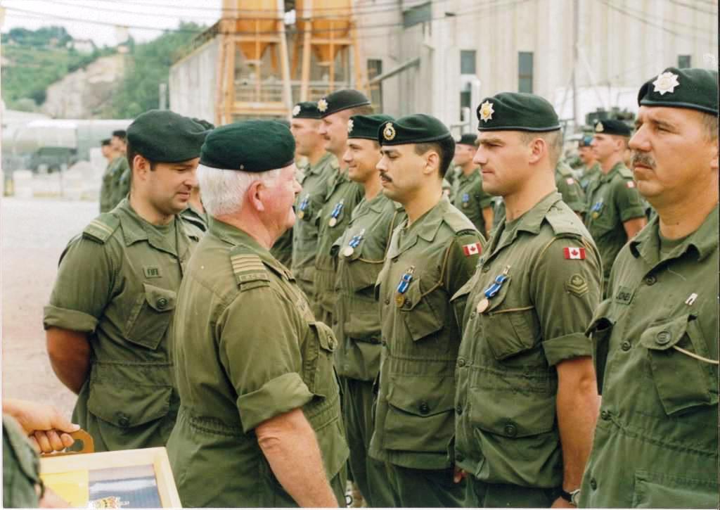 1999, Cpl Ed Pinto, 2 Int Pl receiving his Bosnia medal at Camp Drvar, India Coy, 2RCR, with HCol Jack Vance presenting, with RCR Capt John Fife escorting.