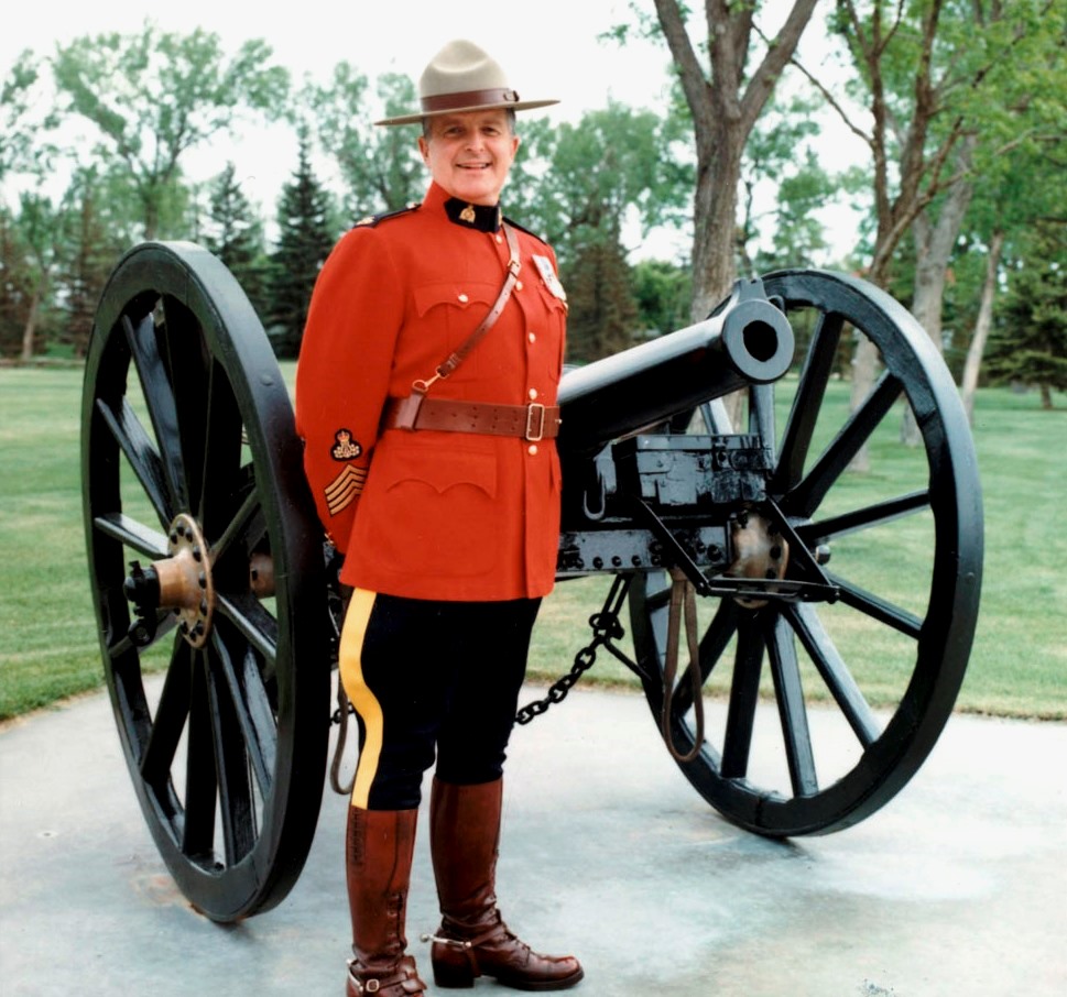 Staff Sergeant Garth Hampson Reg #19201, taken at Depot Division Training Academy in Regina, 1 June 1989. He is standing in front ofa 9-pounder 8-cwt Muzzleloading Rifle, weight 8-1-0 (924 lbs), 1870, 0-2-5-2, Queen Victoria cypher, mounted on a field carriage, on the Parade Ground.