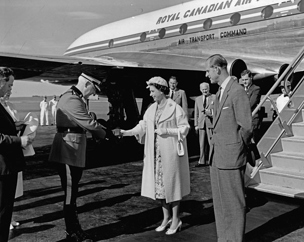 de Havilland DH.106 Comet flown during the 1959 Royal Visit Canada. RCMP Inspector E. Portier Officer Commanding the Calgary Sub-Division, is introduced to Queen Elizabeth II on her arrival at Calgary Airport, Alberta, on 9 July 1959.