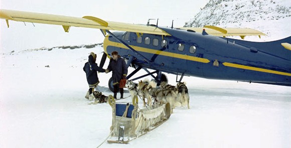 Royal Canadian Mounted Police Corporal J. Munroe greets Inspector Dent-Dog team and de Havilland Otter, CF-MPW, on river ice.