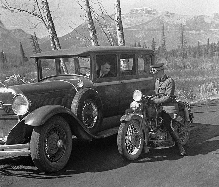 1954 Ford Black & White RCMP patrol car. 1952 Pontiac Laurentian Pontiac 2DR and two 1954 Harley Davison Motor cycles. Because of the Ford model year the photo may be from 1954 and certainly no later than 1955. (Terry Hawkins)