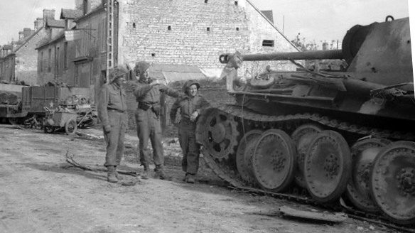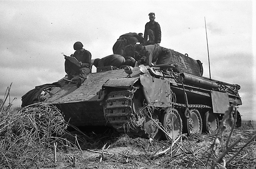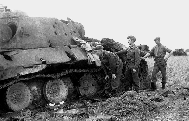 Officers examining German Panzerkampfwagen Panther tank from 3./12. SS-Panzer-Division “Hitlerjugend”, which was knocked out by Canadians at Norrey-en-Bessin, Normandy, 8 July 1944.
