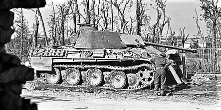 At the time of the invasion of Normandy in June 1944, there were initially only two Panther-equipped Panzer regiments in the Western Front, with a total of 156 Panthers between them. From June through August 1944, an additional seven Panther regiments were sent into France, reaching a maximum strength of 432 in a status report dated 30 July 1944.The majority of the German tank forces in Normandy – six and a half divisions – were drawn into fighting the Anglo-Canadian forces of the 21st Army Group around the town of Caen. The numerous operations undertaken to secure the town became collectively known as the Battle of Caen. While there were areas of heavy wooded bocage around Caen, most of the terrain was open fields which allowed the Panther to engage the attacking enemy armour at long range — its combination of superior armour and firepower allowed it to engage at distances from which the Shermans could not respond. Conversely, by the time of the Normandy Campaign, British divisional Anti-tank Regiments were well equipped with the excellent 17-pounder gun, and some US-supplied M10 tank destroyers had their 3-inch gun replaced with the 17-pdr (including the 17-pdr SP Achilles), making it equally as perilous for Panthers to attack across these same fields. The British had begun converting regular M4 Shermans to carry the 17-pounder gun (nicknamed Firefly) prior to the D-Day landings. While limited numbers meant that during Normandy usually not more than one Sherman in each troop of four tanks was a Firefly variant, the lethality of the gun against German armour made them priority targets for German gunners. (Wikipedia)