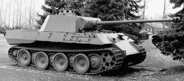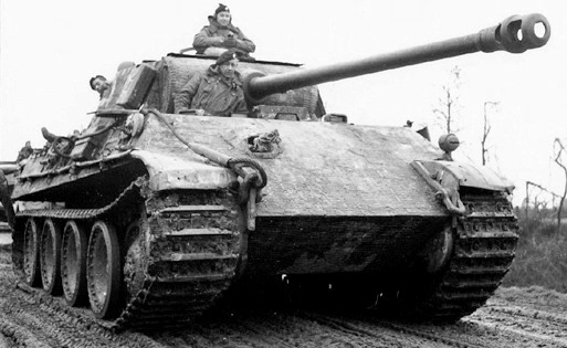The PzKpfw Panther medium tank, officially Panzerkampfwagen V Panther (abbreviated PzKpfw V) with ordnance inventory designation: Sd.Kfz. 171, was used on the Eastern and Western Fronts from mid-1943 to the end of the war in May 1945.The Panther was intended to counter the Soviet T-34 medium tank and to replace the Panzer III and Panzer IV. Nevertheless, it served alongside the Panzer IV and the heavier Tiger I until the end of the war. It had excellent firepower, protection and mobility, although its reliability was less impressive.The Panther had the same Maybach V12 petrol (690 hp) engine as the Tiger I. It had better gun penetration, was lighter and faster, and could traverse rough terrain better than the Tiger I. The trade-off was weaker side armour, which made it vulnerable to flanking fire and a weaker high explosive shell. The Panther proved to be effective in open country and long-range engagements.The Panther was far cheaper to produce than the Tiger I. Key elements of the Panther design, such as its armour, transmission, and final drive, were simplifications made to improve production rates and address raw material shortages. The Panther was rushed into combat at the Battle of Kursk in the summer of 1943 despite numerous unresolved technical problems, leading to high losses due to mechanical failure. Most design flaws were rectified by late 1943 and early 1944, though the bombing of production plants, increasing shortages of high-quality alloys for critical components, shortage of fuel and training space, and the declining quality of crews all impacted the tank’s effectiveness. Though officially classified as a medium tank, at 44.8 metric tons the Panther was closer in weight to contemporary foreign heavy tanks. The Panther’s weight caused logistical problems, such as an inability to cross certain bridges, otherwise the tank had a very high power-to-weight ratio which made it highly mobile. The naming of Panther production variants did not, unlike most German tanks, follow alphabetical order: the initial variant, Panther “D” (Ausf. D), was followed by “A” and “G” variants. (Wikipedia)