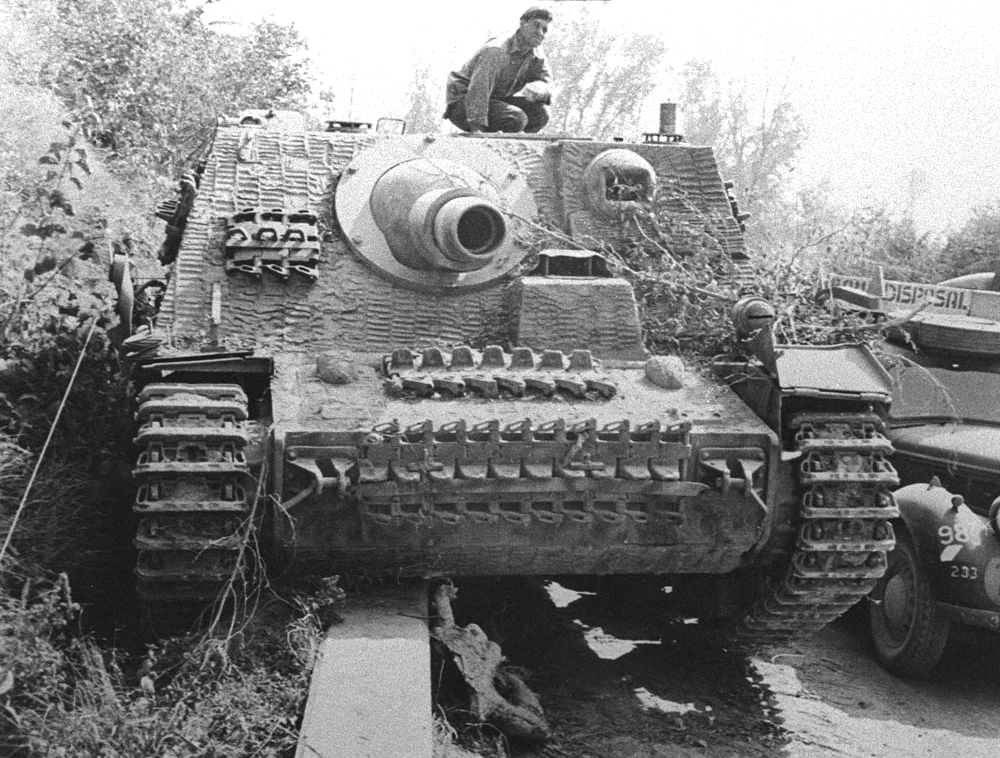 Front view of Brummbär (Grouch) (s Sturmpanzer 43 or Sd.Kfz. 166) armoured infantry support gun based on the Panzer Mk. IV chassis of the Wehrmacht, France, 1944. German soldiers nicknamed it the “Stupa“. Just over 300 vehicles were built and they were assigned to four independent battalions.