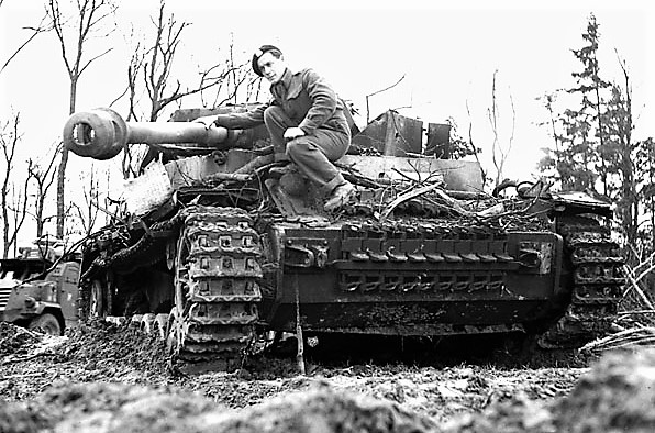 Trooper M.E. Lucy of The South Alberta Regiment examining a German 75-mm Panzerkampfwagen IV tank near Xanten, Germany, 7 March 1945.
