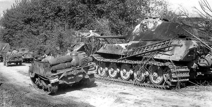 6 Brigade, 2nd Canadian Infantry Division, the T17E1 Staghound is with the 12th Manitoba Dragoons, 18th Armoured Car Regiment, on the road to Vimoutiers, France. The crew and motorcycle rider are passing a destroyed German Tiger II [Panzerkampfwagen Tiger Ausf. B], 22 August 1944. The Tiger II is number 132 1./s.Pz.Abt 503, destroyed by its own crew. A Bergepanther stands in front of the Tiger II, located in la Fauvetiere before Vimoutiers.
