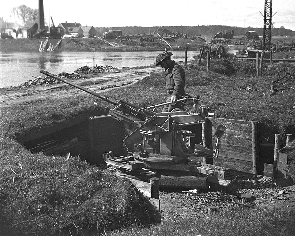 4th Canadian Armoured Division soldier examining a German 20-mm FlaK 30/38 anti-aircraft gun position on the northeast side of the Dortmund-Ems Canal, 8 April 1945. 20-mm anti-aircraft guns were common in the German army and were an effective weapon in the fight against low-flying air targets. Before the Second World War began, the main forces of flak were part of the Luftwaffe. Each division of the Wehrmacht, however, was equipped with the Flak.30/38.
