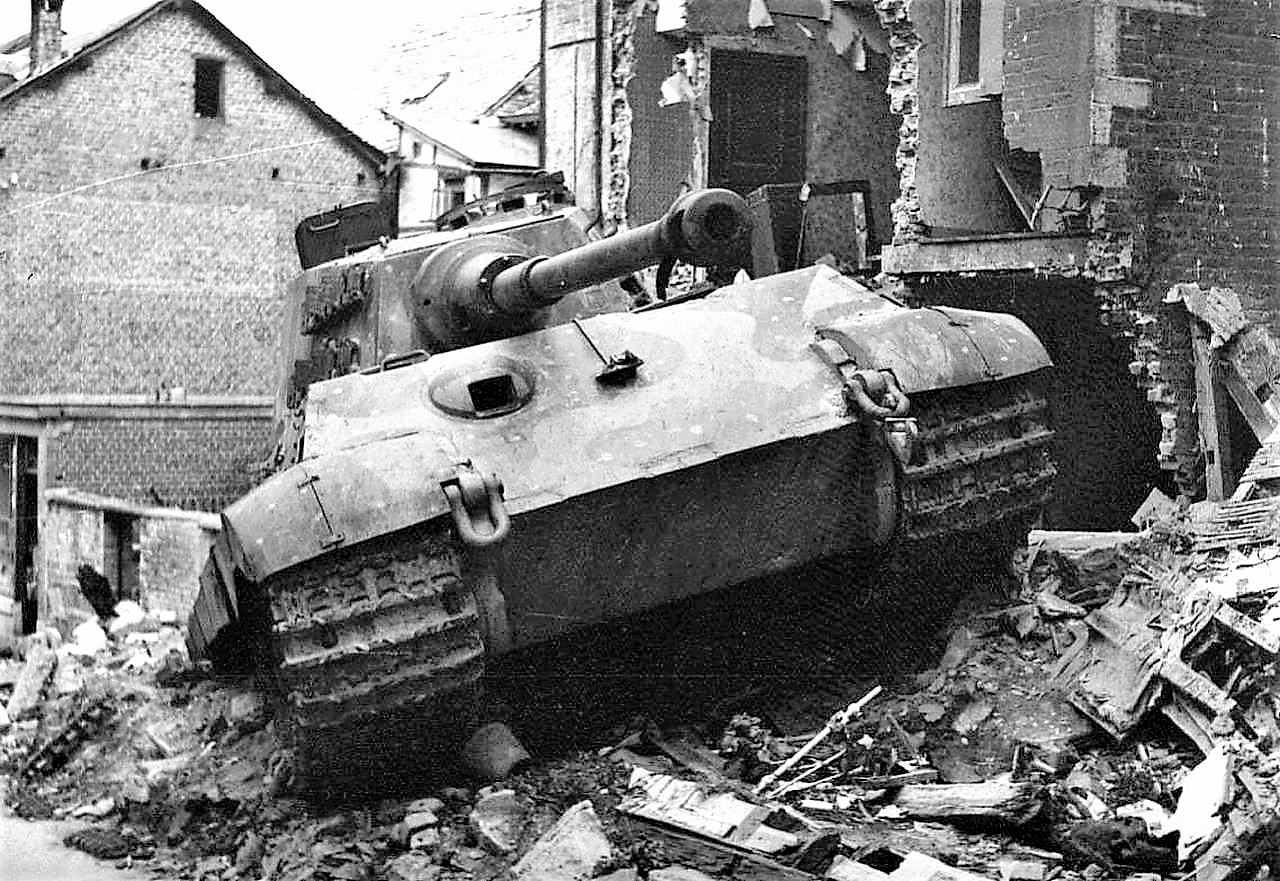 When this King Tiger, No. 105, commanded by SS-Obersturmführer Jürgen Wessel, was struck by bazooka fire, the driver reversed into a the debris of a house and got stuck. The crew abandoned the tank on Rue St. Emilion in Stavelot, Belgium. Wessell jumped on the next tank and continued west towards Trois Ponts, 18 December 1944.