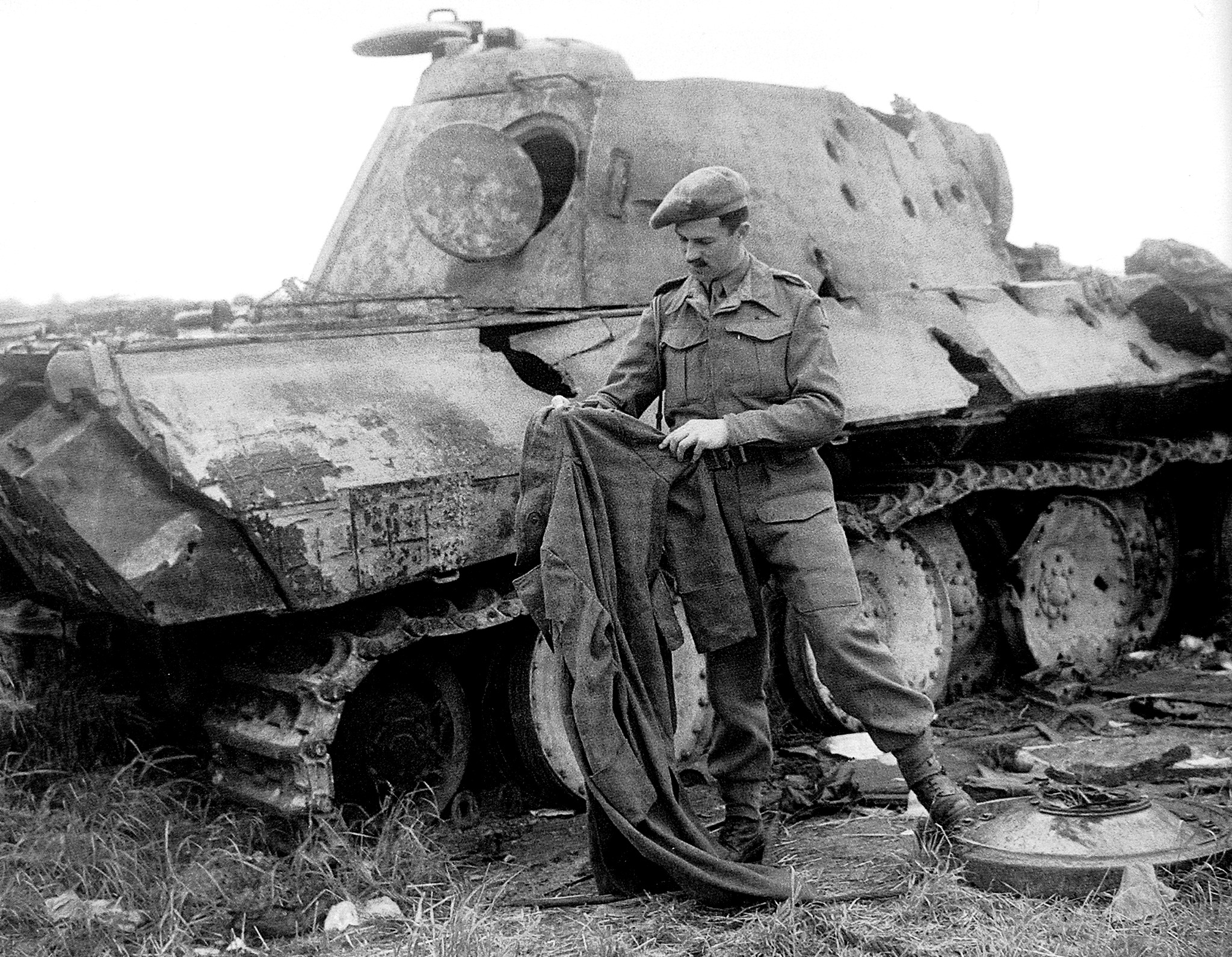 Officer examining German Panzerkampfwagen Panther tank from 3./12. SS-Panzer-Division “Hitlerjugend”, which was knocked out by Canadians at Norrey-en-Bessin, Normandy, 8 July 1944. The shell holes are impacts from direct fire, so the shots came from tank and anti-tank guns.