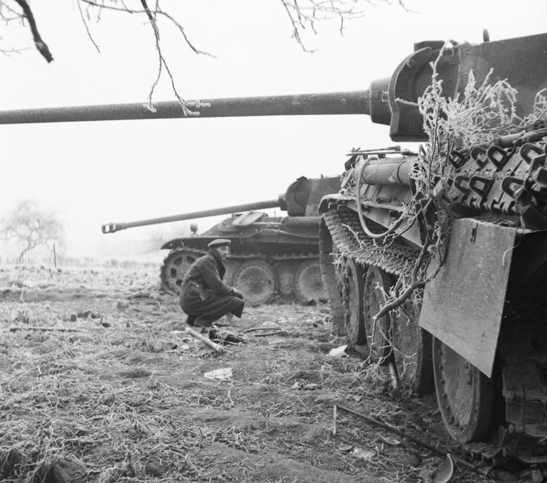 A soldier inspects two knocked-out German PzKpfw V Panther tanks near Foy-Notre-Dame, Belgium, 29 December 1944.