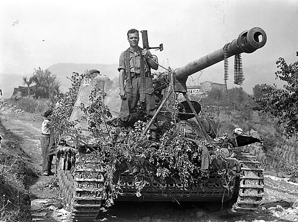 Canadians sheltering behind a destroyed Panzer IV tank, hinterland of Salerno. Operation Avalanche. September 1943.