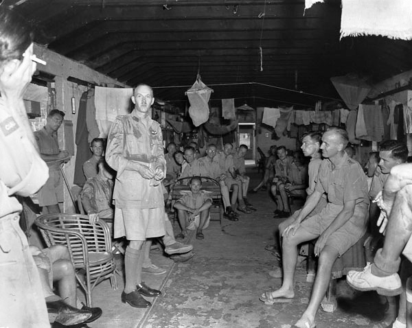 Commander Peter MacRitchie of HMCS Prince Robert meeting with liberated Canadian prisoners-of-war at Shamshuipo Camp, Hong Kong, August 1945.