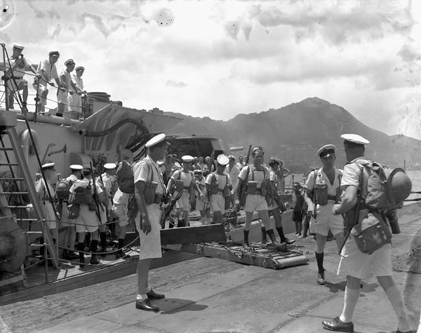 Landing party disembarking from HMCS Prince Robert during the liberation of Hong Kong, ca. 30 August 1945.
