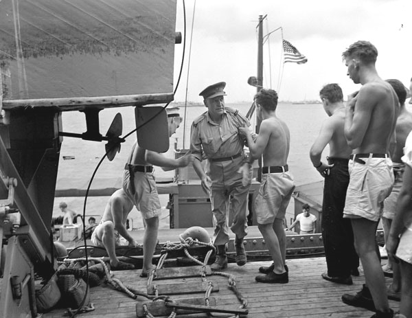An unidentified Canadian officer (possibly Colonel McKenna) being helped aboard HMCS Prince Robert, Hong Kong, 29 September 1945.